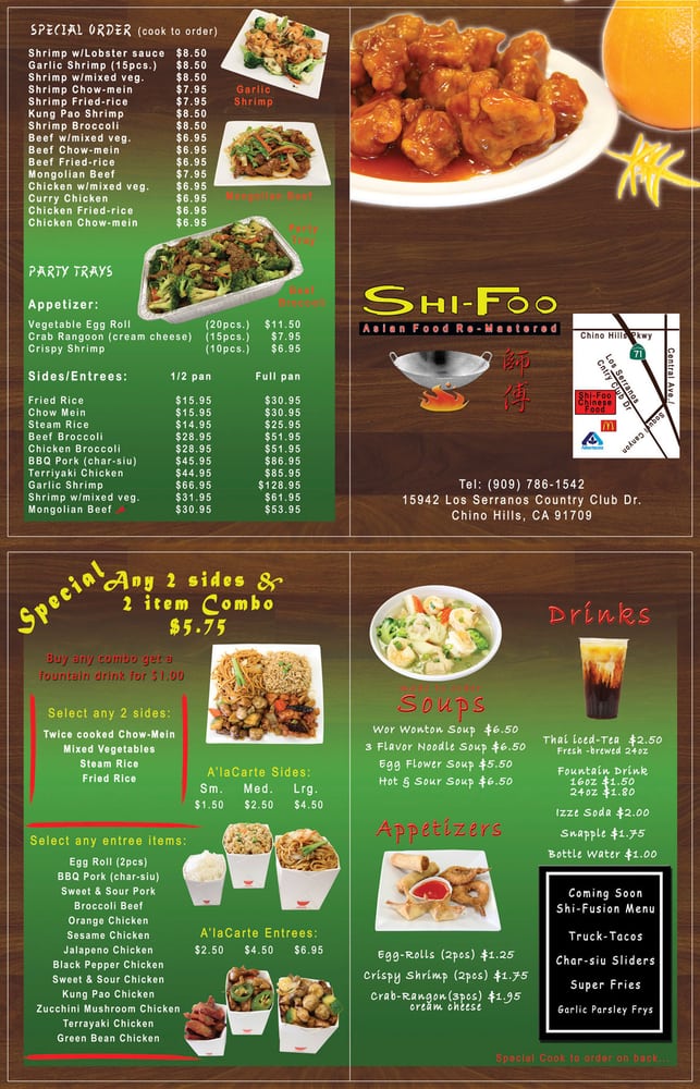 Introducing "Shi-Foo" - a casual dining spot in Chino Hills, CA, offering a variety of Chinese cuisine options. With vegan and vegetarian choices, this restaurant caters to diverse palates and lifestyles. Customers praise the fresh and flavorful dishes, like ginger fish, sesame chicken, and combination fried rice. The menu boasts dishes like beef chow fun and chow mein, perfect for both solo meals and catering platters. The ambiance is casual, with gender-neutral restrooms and free Wi-Fi for a comfortable dining experience. Prices are moderate, making it a great option for a delicious yet affordable meal. From the fast service to the tasty food, "Shi-Foo" is a must-try for fans of Chinese cuisine.